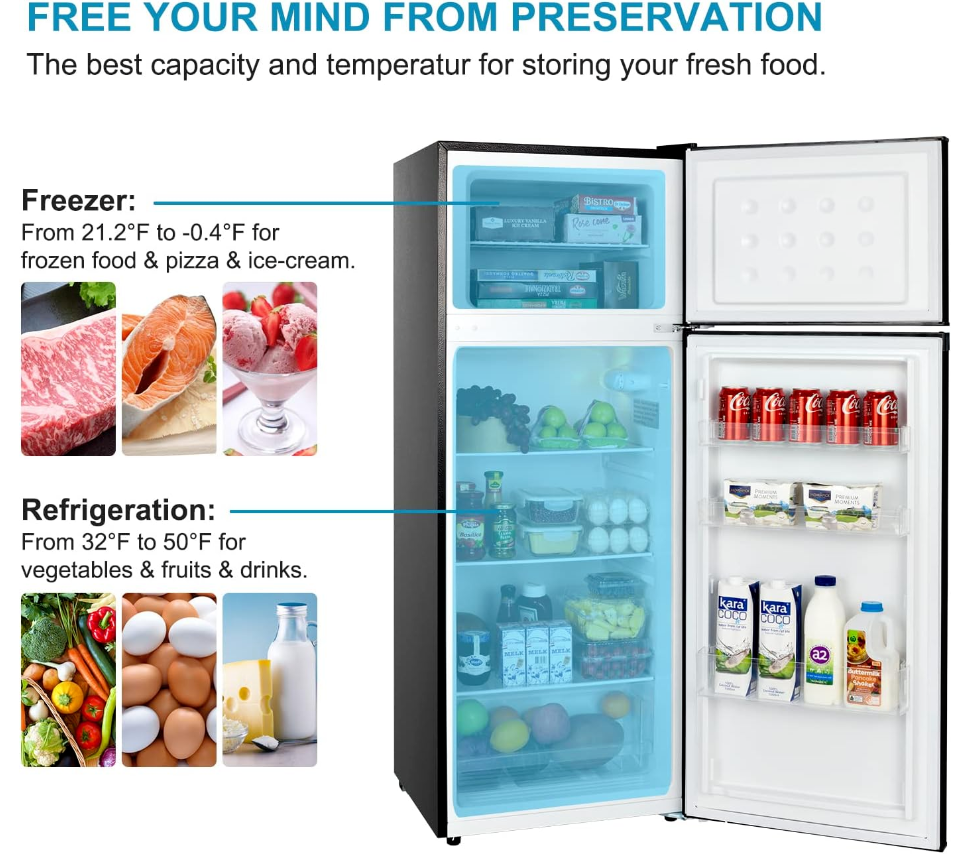 7 Adjustable Temperature Control: From 21.2°F to -0.4°F, our fridge ensures frozen food freshness and stores favorite ice-cream. Performed from 32°F to 50°F in refrigerator zone, the refrigerator keeps ingredients fresh and locking moisture.