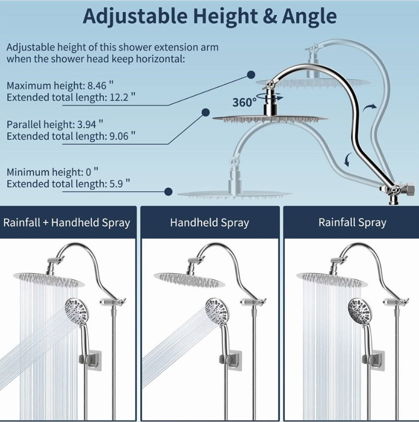 • 12'' Upgrade Adjustable Shower Extension Arm: Height & angle adjustable curved shower head arm extension fits any rain shower head or handheld shower head, height can be adjusted up and down, shower head is always vertical in your large size and will not hit the shower arm, instead of sloping water like ordinary straight shower arms. Curved shape design enhances its bearing capacity, high rise your shower head, and can achieve vertical water.
