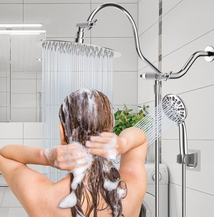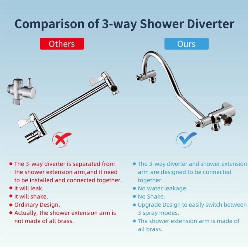 • Upgraded 3-Way Diverter Valve: This shower head combo is very easy to install without tools or plumbers. The 3-way diverter can be used with a shower head/rainfall shower head alone, or with two showers at the same time. Our 3-way diverter and shower extension arm are designed to be connected together without leaking and shaking, while ordinary 3-way diverter is separated from extension arm, and it needs to be installed and connected together,which will lead to leak and shake.