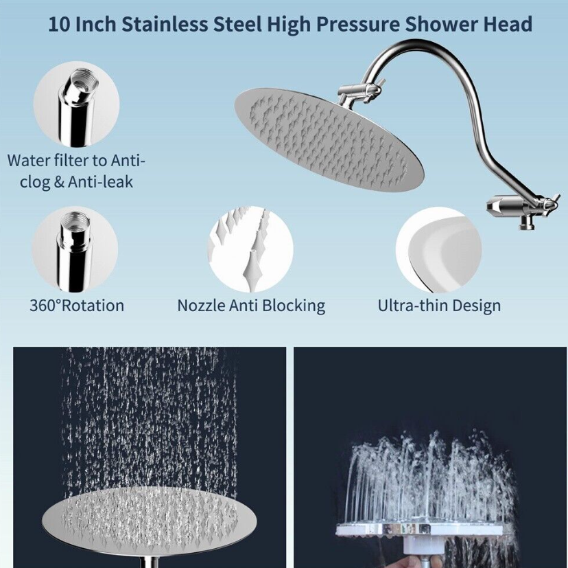 • 10'' Rainfall Shower Head: The large rainfall all metal round shower head body is made of certificated SUS 304 stainless steel to ensure rust resistance, durability, and long service life. Combined ultra-thin design with air-in technology, the large shower head has 126 splash jets that delivering a rain spray. The brass swivel ball connector adjust the shower head to any angle you want to enjoy a relaxing hotel-style bathing experience.