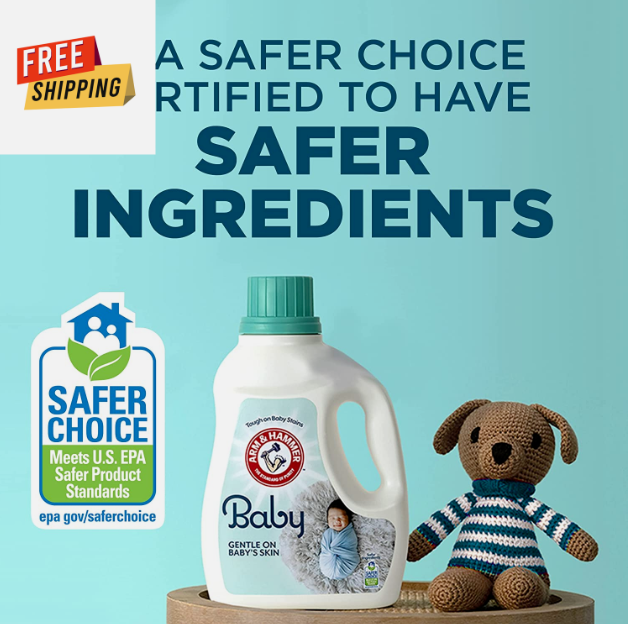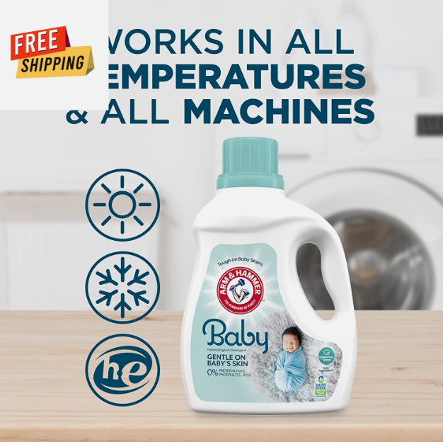• Cleans tough stains in cold water. This hypoallergenic baby laundry detergent is ideal as a High Efficiency (HE) laundry detergent liquid for a powerful clean that’s gentle on newborn skin. Contains trusted ARM & HAMMER Baking Soda