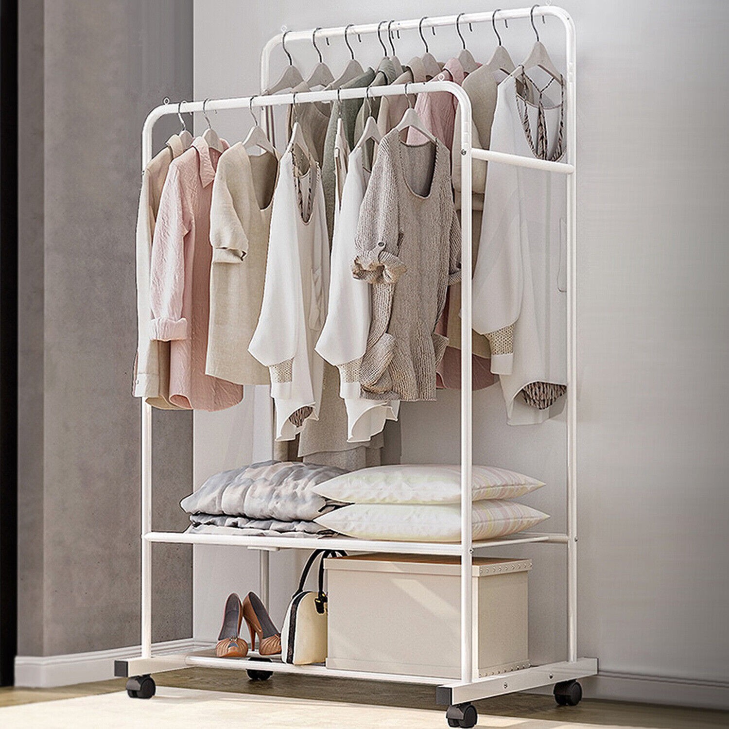 Clothing Rack with Wheels Double Rails Rolling Rack Bedroom Shoe Garment Rack