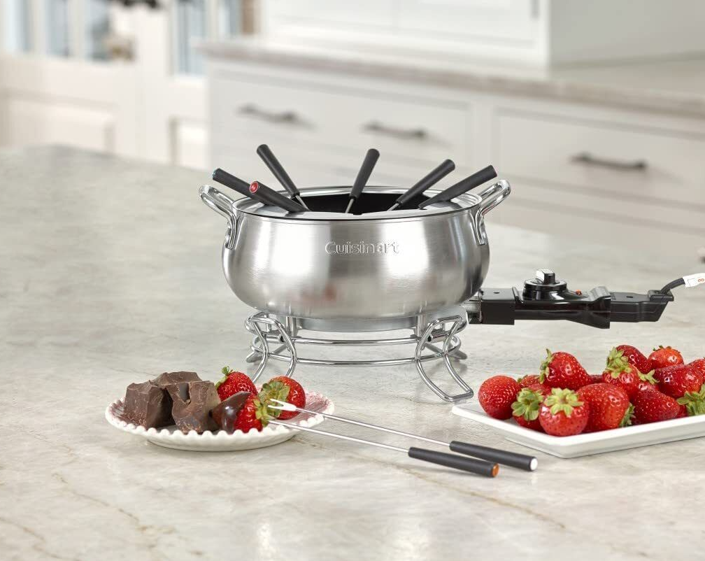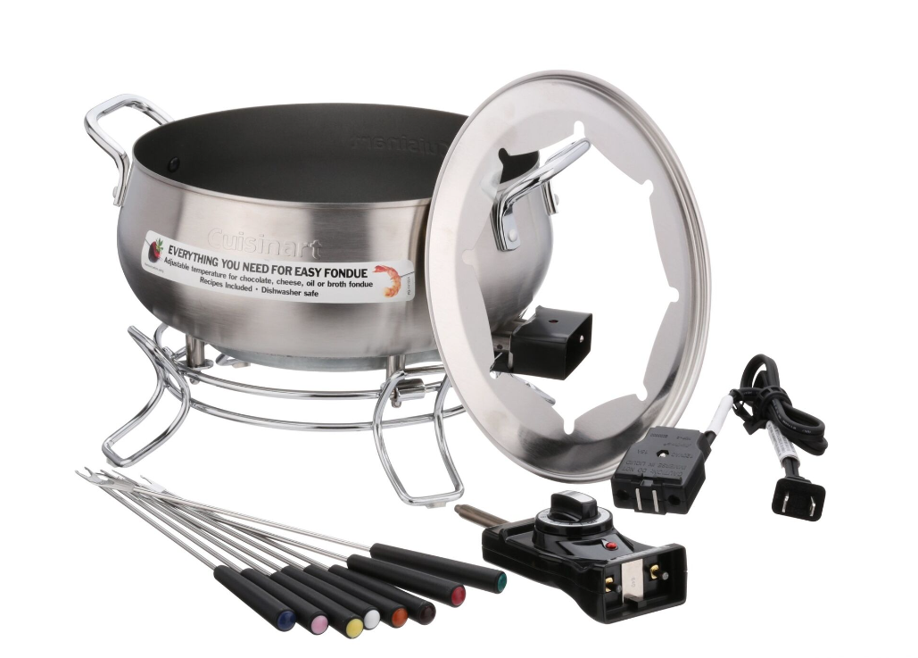 This 3-quart capacity 1000-watt electric fondue set is suitable for chocolate, cheese, broth and or oil