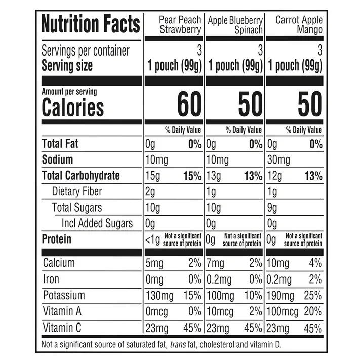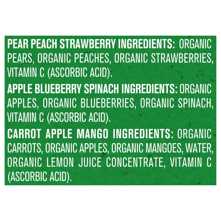 • Features three (3) Pear Peach Strawberry pouches, three (3) Carrot Apple Mango pouches and three (3) Apple Blueberry Spinach pouches