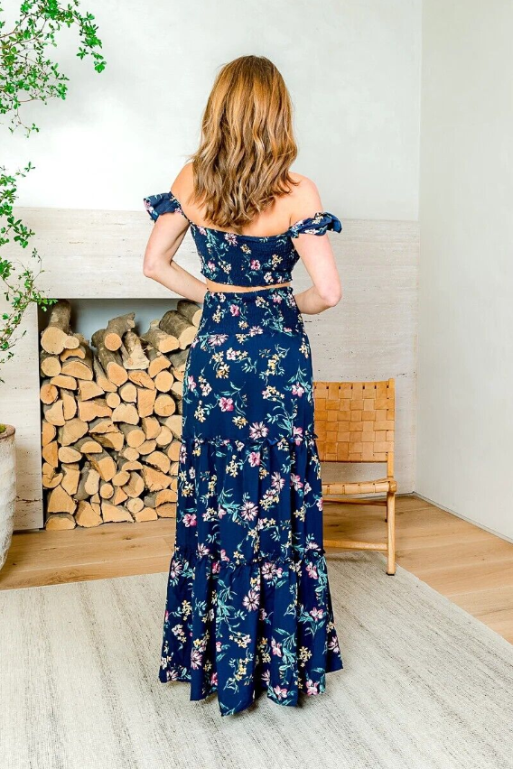Navy Blue Floral Crop Top and Maxi Skirt Set