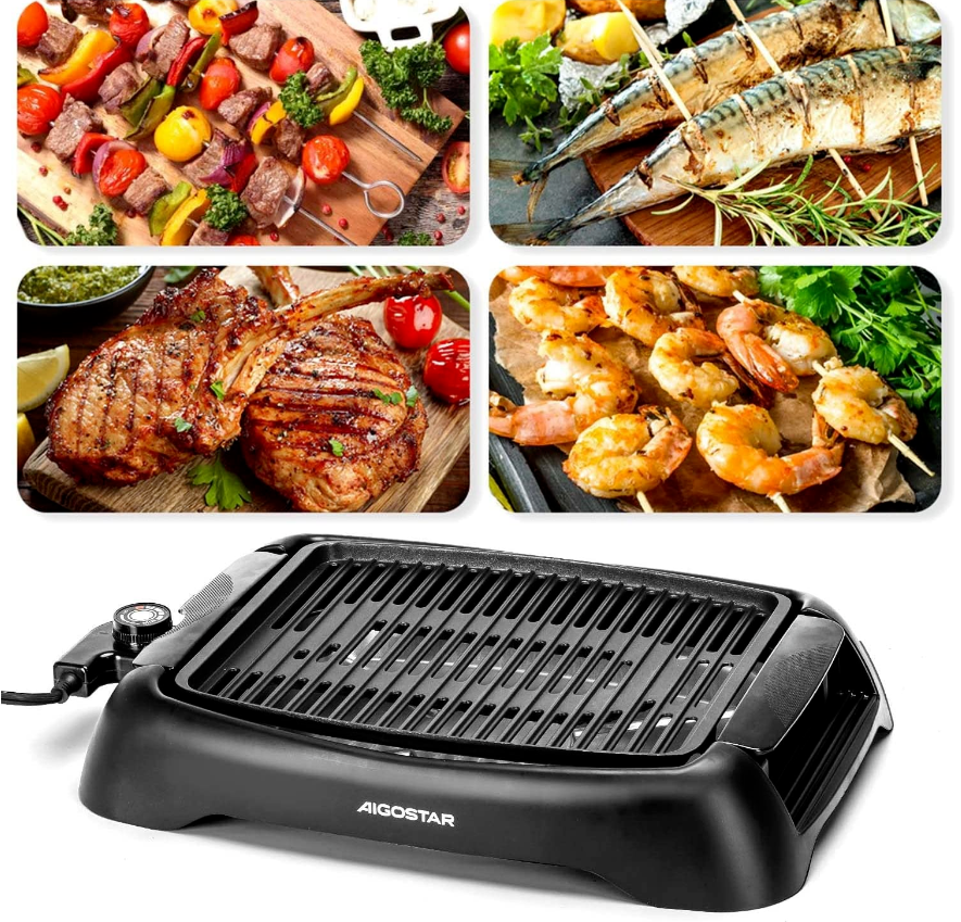 • : Smokeless electric grill indoor is big enough for the whole family party. Enjoy making grilled steak, chicken skewers, bacon, fish, kabobs, pork chops, burgers, chicken, salmon, vegetables and more! Optimal choice for BBQ, family meals, Parties, Holiday, Halloween, Thanksgiving Day, Christmas, Valentine's Day. The grill electric not only can be used at home, but also is perfect for picnics, RV, camping etc.