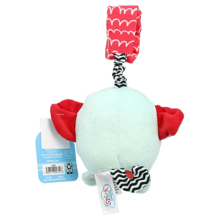 The Spark Create Imagine Blue Elephant Travel Chimes are soft plush toys that give an engaging chime sound when shaken. This elephant toy incorporates crinkle feature for additional tactile stimulation. The bright colors and patterns as well as its friendly face will provide visual stimulation and keep your child engaged. The 3.5” travel chimes are soft to touch and easy to grab; made for tiny hands. The strap at the top of the toy allows it to be attached to bags, strollers, carriers or car seats for use at home and on the go. It encourages grasping, movement, sensory development and interaction in babies, and is suitable for children of all ages.