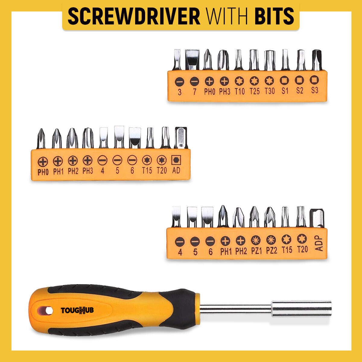 30pcs Bits., Metric socket., 1pc 8" adjustable wrench, Insulation tape, Mini retched wrench., 3m tape measure., Fastener parts., Plastic case, Bit holder., Hammer, Hex Key, Pliers, Screwdriver, Socket
