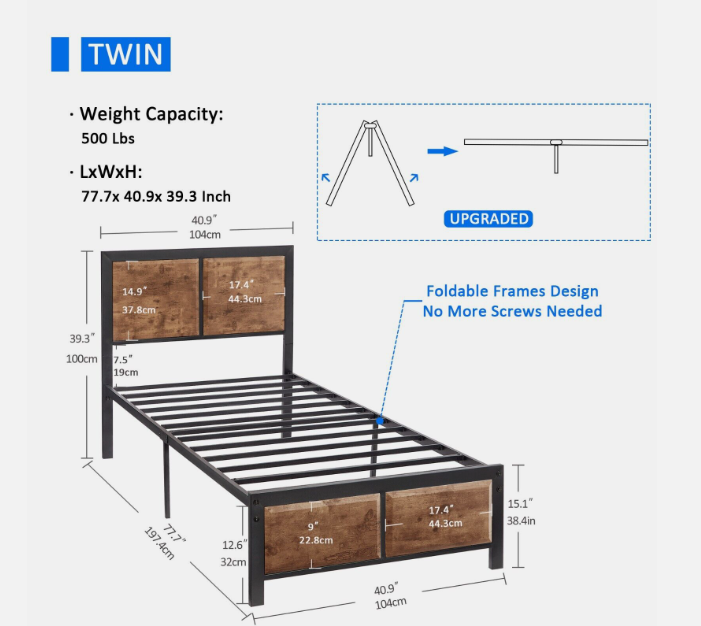 Overall dimensions: 39.3'' H X 40.9'' W X 77.7'' L  (Adapts to standard Twin size mattresses)