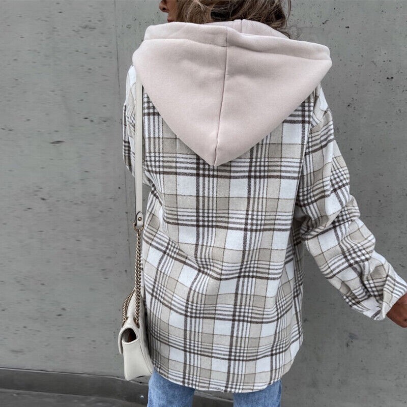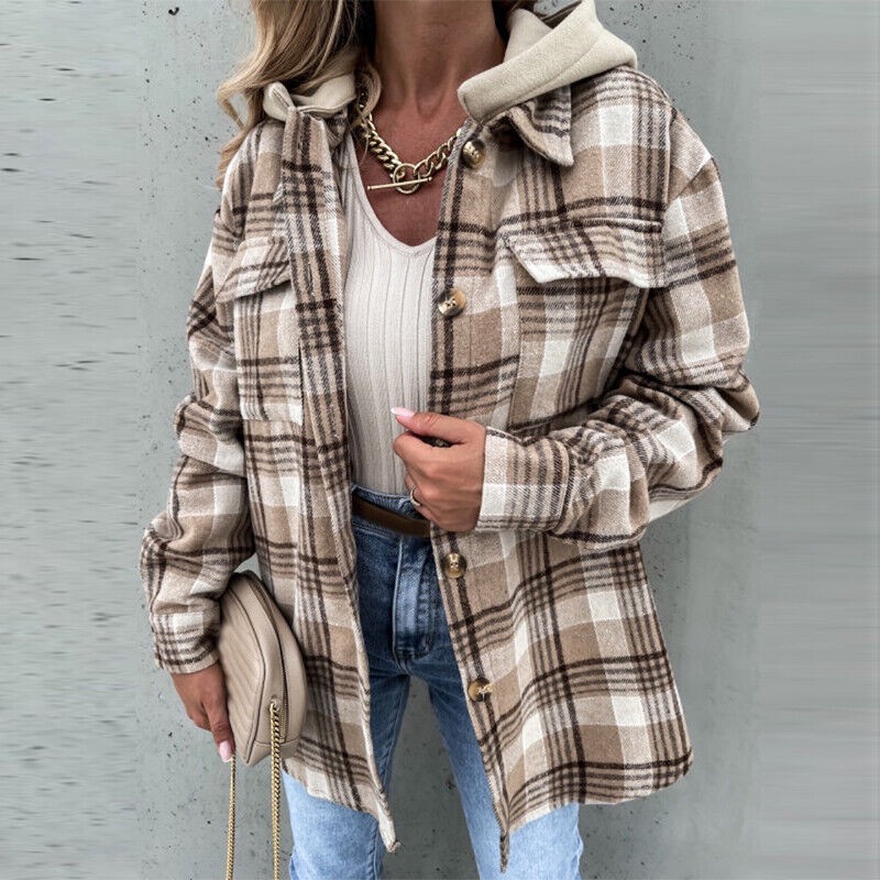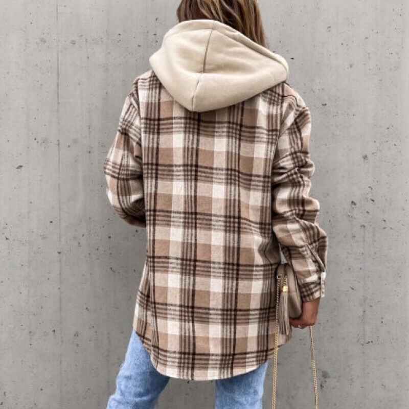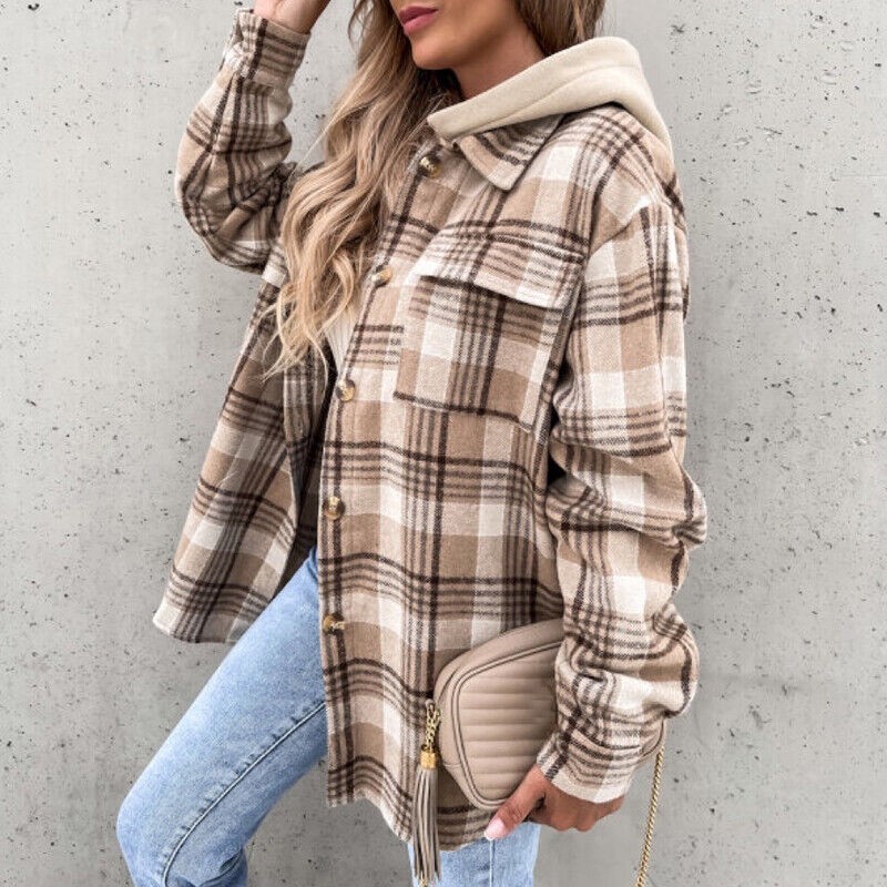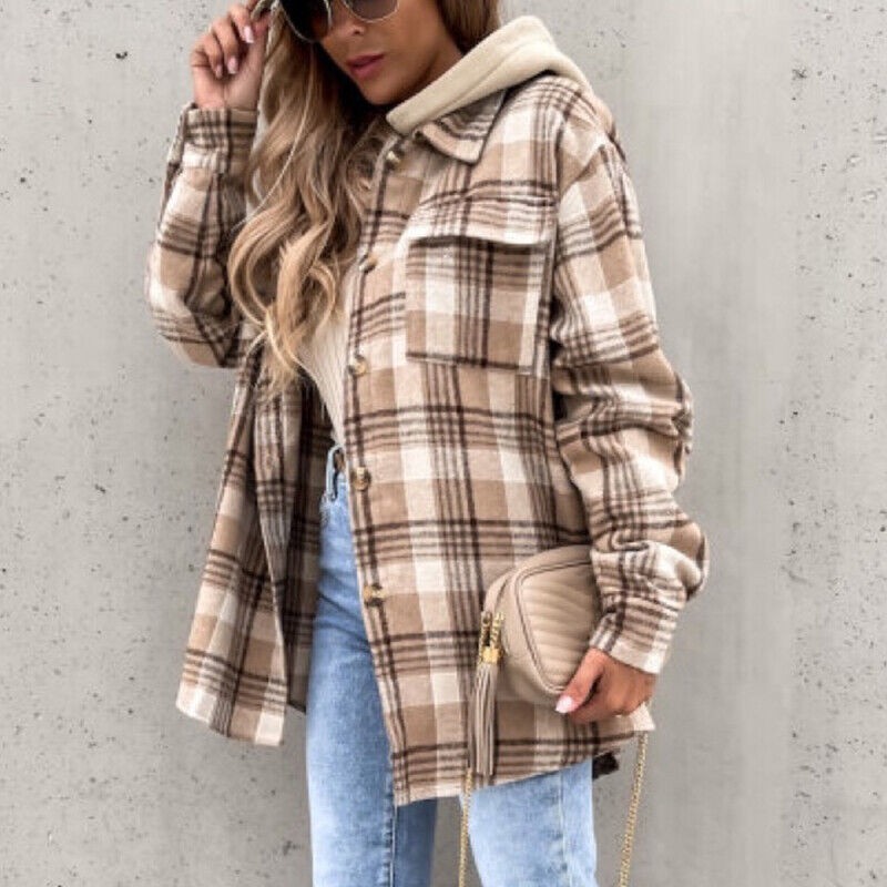 Women's Plaid Check Casual Jacket Shacket Tops Hooded Shirt Loose Coat Oversized